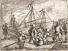 The Spanish galleys formed into three squadrons in order to flank the blockading fleet, but seeing Cangé's vessels too far from Cazencac's squadron, 29 of them led by Melchor de Borja crossed the French formation going astern of the 12 ships under the French Rear Admiral.[8] Then they gained the wind. The thirtieth galley, San Felipe, was closely engaged by two French galleys and surrendered. Two other Spanish galleys which lagged behind were captured by the French La Pille and La Reine commanded by Jean-Philippe de Vallbelle.[9] Melchor de Borja had his galleys badly damaged by Cazenac's ships in the process, but thanks to his manoeuver, the Duke of Fernandina managed to reach the relative safety of the harbor with 11 galleys and the 5 brigantines with supplies.[9] Cangé was able to keep them covered behind the mole, thanks to the heavy gunfire of his ships and gave time to his remaining vessels to join him.[9]