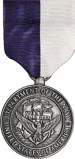 The medal, designed by the United States Mint, is silver in color. The obverse has the Seal of the Navy Department, encircled by the inscription above "DEPARTMENT OF THE NAVY" and below, "UNITED STATES OF AMERICA." The reverse has the words "Awarded to" with a blank tablet for inscription of the recipient's name, resting on a spray of laurel. Arched at the top rim of the reverse of the medal is the word "SUPERIOR." Horizontally, below the tablet, is the word "PUBLIC" and arched along the bottom rim is the word "SERVICE." The medal is suspended by a ribbon using divided in half vertically with blue on the left, and white on the right. Recipients of the award are presented with the full-size medal, in addition to a miniature medal, a mounted ribbon, and a lapel pin. Also included with the award is a certificate signed by the Secretary of the Navy, or the commanding officer authorizing the award.[2]