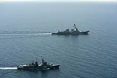 The Egyptian navy was only peripherally involved in the series of conflicts with Israel. On 22 October 1948, the Egyptian sloop El Amir Farouq was sunk in the Mediterranean Sea off Gaza by a motor explosive boat of the Israeli Navy during the Israeli naval campaign in Operation Yoav as part of the 1948 Arab–Israeli War.[8][9] During the Suez Crisis, Egypt dispatched the Ibrahim el Awal, an ex-British Hunt class destroyer, to Haifa with the aim of shelling the city's coastal oil installations. On 31 October the Ibrahim el Awal reached Haifa and began bombarding the city but was driven off by a French warship and then pursued by the Israeli destroyers INS Eilat and INS Yaffo which, with the help of the Israeli Air Force, captured the ship.[10] Egyptian destroyers and torpedo boats engaged larger British vessels in a move aimed at frustrating the amphibious operations of the British and French. On the night of 31 October in the northern Red Sea, the British light cruiser HMS Newfoundland challenged and engaged the Egyptian frigate Domiat, eventually sinking it in a brief gun battle. The Egyptian warship was then sunk by escorting destroyer HMS Diana, with 69 surviving Egyptian sailors rescued.[11]