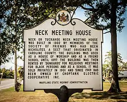 The Neck Meetinghouse and Yard, also known as the Quaker Meetinghouse and Graveyard, is a historic Quaker meetinghouse located at West Denton, Caroline County, Maryland. It is a one-story rectangular frame building with a pitched gable roof measuring 30 feet, 81⁄2 inches long and 20 feet, 5 inches deep. In the graveyard are six marked burials with stones dating from the 1850s to 1890, with some more recent interments. It is the only extant Friends meeting house in Caroline County, and one of only a few still standing on the Eastern Shore. The meeting house was utilized from September 26, 1802, when the first meeting was held in the building, until it was abandoned in 1890 for lack of funds and participants.[2]