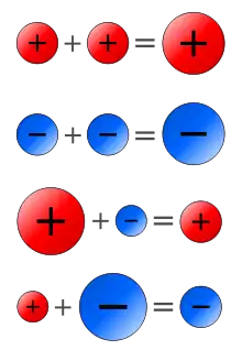 the product of a negative number—al-nāqiṣ (loss)—by a positive number—al-zāʾid (gain)—is negative, and by a negative number is positive. If we subtract a negative number from a higher negative number, the remainder is their negative difference. The difference remains positive if we subtract a negative number from a lower negative number. If we subtract a negative number from a positive number, the remainder is their positive sum. If we subtract a positive number from an empty power (martaba khāliyya), the remainder is the same negative, and if we subtract a negative number from an empty power, the remainder is the same positive number.[5]