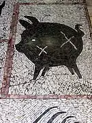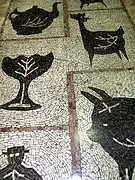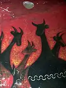 In even worse conditions is Quinchamalí (1958) at the Juan Esteban Montero Gallery: the paint of the mural is peeling and warping due to the humidity. The art restorer Carolina Broschek maintains that the mural can be saved, but the owner of the building on which it is painted, Yusif Tala, opined that the Nemesio Antúnez Foundation should take care of the painting or move it to another place, as has no interest in preserving it.[3] In the same gallery, besides the mural, Antúnez installed floor mosaics which are still in perfect condition.