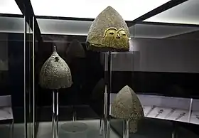 The Nemiya Helmet on the exhibition of the Déri Museum in 2022 with a 10th-century iron helmet from Pécs, Hungary and an 11th-century iron helmet, probably from the Novgorod area
