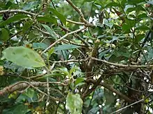 Straight stem with greyish bark and short, slender branches. The leaf flush is smooth, silvery copper, drooping, crowded at the ends of branchlets, and turn bright green when mature. Leaves are lanceolate in shape with a slightly pointed base and a tapering pointed apex, about 6–18 cm long and 1.5–4 cm broad. The three veins beginning from the base are prominent, but the lateral veins are faint on the upper surface. The petiole appears as channeled above. Pale yellow flowers are seen in small clusters borne on short branchlets on the internodes. Male and female flowers are distinguishable. The fruit is dark purple, ovoid in shape, about 1.0 cm in size with a ring-like cap at the base.