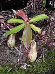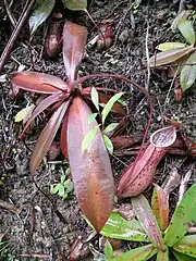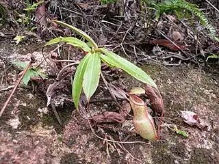 The species is also present on Mount Tahan, which at 2187 m is the highest mountain in Peninsular Malaysia. Its altitudinal range on Mount Tahan is known to extend from 800 to 1350 m. It is common on the mountain's lower slopes and can be seen along the western summit route from Sungai Relau, particularly on the tops of steep ridges at around 800–1200 m.[nb 1] It has been recorded growing along the western trail itself and from other disturbed sites, including areas affected by landslides. Plants have also been observed in dense forest, but these bear comparatively few pitchers. Though there were no confirmed reports of N. benstonei from Mount Tahan prior to 2012, the species's presence there is attested by much older herbarium material.[2]
