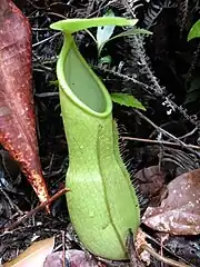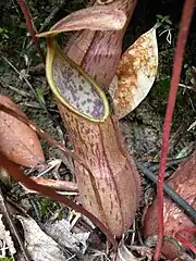 Rosette and lower pitchers reach 20 cm in height[16] and 5 cm in width. They are ovoid in the lower part and cylindrical above, with a pronounced hip in the middle. A pair of fringed wings (≤4 mm wide) runs the whole length of the pitcher cup. The pitcher mouth is round to ovate and oblique throughout. The peristome is up to 6 mm wide and bears very small but distinct teeth along its inner margin. The pitcher lid is ovate and lacks appendages. It bears a short but distinct keel and often has a very broad insertion. A simple or bifurcate spur (≤12 mm long) is inserted near the base of the lid.[12]