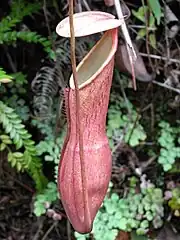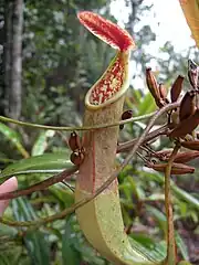 Upper pitchers are similar in most respects to their lower counterparts. They are up to 20 cm high[16] and 3 cm wide. They are infundibular in the lowermost part, narrowly ovoid in the next part, and cylindrical above. The peristome lacks teeth in upper pitchers. The lid is narrower and has a less obtuse apex. The spur is simple and much smaller, reaching only 5 mm in length.[12]