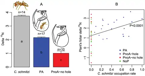 Right: A: Isotopic signatures (δ15N) of C. schmitzi, ant-occupied plants (PA), and unoccupied plants with no evidence of previous colonisation (PnoA-no hole). B: Relationship between C. schmitzi occupation rate and plant foliar δ15N.[5]