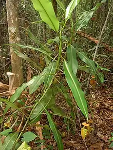 The leaves of N. bicalcarata are petiolate and coriaceous in texture. The lamina is obovate-lanceolate in form and also reaches huge dimensions, growing to 80 cm in length and 12 cm in width.[14] It is slightly decurrent on the stem, forming two narrow wings. The lamina has indistinct longitudinal veins and numerous pennate veins. Tendrils may be up to 60 cm long and 8 mm wide. They are hollow and swollen near the pitcher.[11]