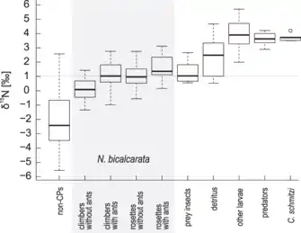 Left: Natural nitrogen isotope abundance ratio (δ15N) of ant-occupied and unoccupied N. bicalcarata plants (highlighted in grey), associated food web components, and non-carnivorous plants ("non-CPs"). The dotted horizontal line indicates the median δ15N of prey insects.[44]