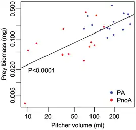 Right centre: Prey biomass accumulated over a pitcher's entire lifespan as a function of pitcher volume in ant-occupied and unoccupied lower pitchers.[5]