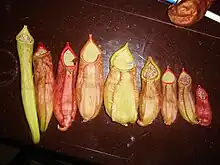 Rosette and lower pitchers are either wholly ovate or only ovate in the basal third of the pitcher cup and narrower above. They measure up to 12 cm in height by 5 cm in width and are broader than they are deep. The hip, when present, is positioned in the midsection of the trap. A pair of wings (≤6 mm wide) runs down the ventral surface of the pitcher cup, bearing narrow fringe elements. The pitcher mouth is orbicular to ovate and has an oblique insertion. The peristome is cylindrical and up to 5 mm wide at the sides, with teeth up to 0.3 mm long. The pitcher lid or operculum is orbicular to ovate or elliptic. It is flat and has a slightly cordate base. It measures up to 4 cm in length by 3.5 cm in width. The lower surface of the lid does not have any appendages, but bears numerous crater-like glands (≤1 mm in diameter), the largest of which are located around the base of the midline. An unbranched spur (≤6 mm long) is inserted near the base of the lid. On their outer surface, terrestrial pitchers are typically green to orange or pink with red stripes. Red blotches may or may not be found in the waxy zone of the inner surface. The peristome ranges in colour from green to red.[1]