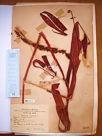 Nepenthes chang was formally described by Marcello Catalano in his 2010 book, Nepenthes della Thailandia: Diario di viaggio.[2] The description was reviewed by Alastair Robinson, while Andreas Fleischmann provided the Latin translation.[1] Catalano 013394 was designated as the holotype. This specimen was collected by Catalano in 2009 from Ko Chang island at an altitude of about 300 m. It is deposited at the Chulalongkorn University Herbarium (BCU).[1]