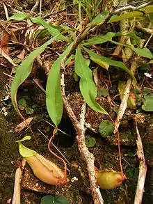 Leaves are sessile and coriaceous in texture. The lamina (leaf blade) is lanceolate, measures up to 35 cm in length by 5 cm in width, and is around 0.2 mm thick. Its apex is acute and it is attenuate at the base, clasping the stem for around three-quarters of its circumference and being decurrent for up to 4 cm. Three longitudinal veins are present on either side of the midrib, restricted to the distal quarter of the lamina. Pinnate veins are also visible, and arise obliquely from the midrib. Tendrils are up to 30 cm long and 2 mm in diameter. They are coiled in upper pitchers. The laminae of older leaves are typically dark green, whereas those of younger leaves range in colour from reddish in rosettes, through an orange hue on laminae of the lower stem, to yellowish on the upper stem. Like the stem, the midrib and tendrils are orange to red in rosettes and light green in climbing plants.[1]