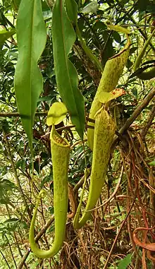 The tubulose upper pitchers are considerably larger than their terrestrial counterparts, measuring up to 25 cm in height by 3 cm in width. The wings, if present, are up to 1 mm wide, otherwise they are reduced to a pair of ridges. The pitcher mouth has an oblique insertion. The peristome of upper pitchers often has a slightly lobed outer margin and is uniform in width. The lid as well as other parts of the pitcher are similar to those found in terrestrial traps. Aerial pitchers have a lighter pigmentation than their lower counterparts, being light green on the outer surface. Red blotches may or may not be present on the waxy inner surface. The peristome is green throughout, while the lid may be entirely green or bear fine red stripes.[1]