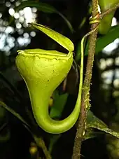 Upper pitchers are tubular to narrowly infundibular in the lower two-thirds, becoming broadly infundibular above.[2] Characteristically, the hollow pitcher tube often continues past the curved basal portion and for some distance up the tendril.[2] Upper pitchers are similar in size to their terrestrial counterparts, reaching 6 cm in height by 3.5 cm in width.[2] The peristome is flattened and expanded, reaching 15 mm in width. As in lower pitchers, its outer margin is undulate. The peristome ribs are up to 0.2 mm high and spaced up to 0.5 mm apart.[2] The lid is ovate or elliptic[2] and has a somewhat truncate apex. It measures up to 4 cm in length by 2.5 cm in width. A reduced basal crest may be present on the underside of the lid[1] or it may be absent entirely.[2] Other parts are similar to those found in terrestrial traps. Upper pitchers are typically yellow throughout, but some specimens may have a completely red or red-striped peristome and mature traps may be orange or reddish on the upper surface of the lid.[1][2]