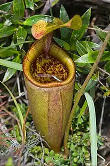 Colouration of the vegetative parts is variable. The laminae and petioles are often green throughout when produced in shaded conditions and red to purple in plants exposed to direct sunlight. Both lower and upper pitchers are predominantly green to yellow on their outer surfaces, often flecked with red to purple markings on the interior. Wholly red or purple lower pitchers have not been recorded. The peristome is often red, purple or brown in lower pitchers and orange to red in uppers. The lid is yellow to orange, sometimes tinged red.[2]