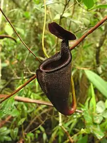 | An upper pitcher of a particularly dark variant of N. leonardoi, photographed by co-discoverer Stewart McPherson | |