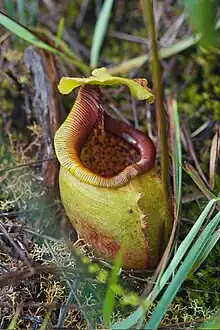 Rosette and lower pitchers are usually ovate or obconic, although ones that develop embedded in substrate often have a more globose shape. Pitchers produced on older plants are generally more elongated with a narrower basal portion. Terrestrial pitchers are quite small, typically reaching only 15 cm in height by 6.5 cm in width, although particularly globose traps may be 12 cm wide. A pair of wings (≤8 mm wide), with fringe elements up to 5 mm long, usually runs down the ventral surface of the pitcher cup, although the wings may occasionally be reduced to ribs. The peristome is approximately cylindrical and up to 2 cm across. It bears ribs up to 2 mm high and spaced up to 3 mm apart, which terminate in curved teeth up to 5 mm long. The peristome is elongated into a neck at the rear, where the teeth on the two lobes of the peristome run apart to form distinctive gap. The pitcher lid or operculum is cordate (heart-shaped) and may have a rounded or pointed tip. It measures up to 5 cm in length by 4 cm in width and does not bear any appendages. The spur, which is inserted near the base of the lid, is up to 8 mm long and may be simple or branched.[3]