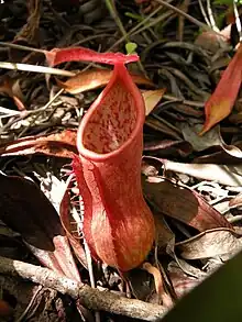 Rosette and lower pitchers are either wholly ovate or only ovate in the basal half of the pitcher cup and narrower above. They measure up to 14 cm in height by 6 cm in width. The hip, which is only faintly visible, is positioned either in the middle or in the upper half of the trap. A pair of wings (≤8 mm wide) runs down the ventral surface of the pitcher cup, bearing narrow fringe elements. The pitcher mouth is oval and has an oblique insertion. The peristome is cylindrical and up to 12 mm wide, with teeth up to 0.5 mm long. The pitcher lid or operculum is round with a slightly cordate base and an irregularly wavy margin. It measures up to 4.3 cm in length by 4.7 cm in width, being as large as the mouth. The lower surface of the lid does not have any appendages, but bears numerous crater-like glands (≤1 mm in diameter), the largest of which are located around the midline. The spur, which is inserted near the base of the lid, is up to 7 mm long and may be simple or branched. Terrestrial pitchers are typically orange with red blotches on their outer surface. These red markings are also found in the waxy zone of the inner surface. The peristome and lid range in colour from orange to red.[2]