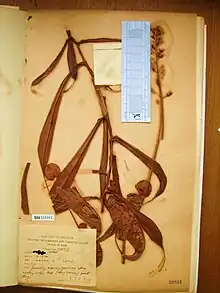 Nepenthes kerrii was formally described by Marcello Catalano and Trongtham Kruetreepradit in Catalano's 2010 book, Nepenthes della Thailandia: Diario di viaggio.[4] The description was reviewed by Alastair Robinson, while Andreas Fleischmann provided the Latin translation.[2] Kerr 14127 was designated as the holotype. Contrary to McPherson's interpretation, Catalano and Kruetreepradit excluded the Langkawi taxon from their circumscription of N. kerrii and identified N. kongkandana as its closest relative.[2][4] The 2018 IUCN assessment considers Langkawi specimens to be conspecific.[1] In 2024, the Langkawi Nepenthes was published as Nepenthes ridzaiana. [7]