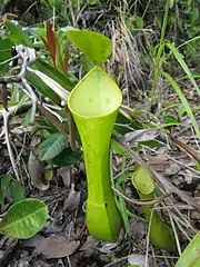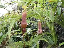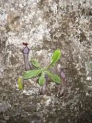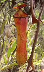 Upper pitchers are typically somewhat infundibular in the lowermost part, becoming narrowly ovoid in the lower third, and finally cylindrical and slightly narrower above. They may be quite large, reaching 25 cm in height by 5 cm in width.[5] The waxy zone of the inner surface is well developed.[8] A pair of remnant ribs is present in place of the ventral wings.[5] The inner portion of the peristome accounts for around 40% of its total cross-sectional surface length.[8] Other parts of aerial pitchers are similar to their lower counterparts.[5]