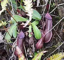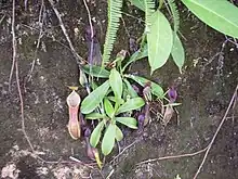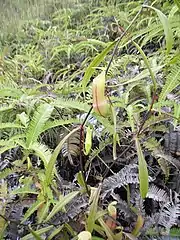 Nepenthes tobaica commonly grows among dense populations of ferns