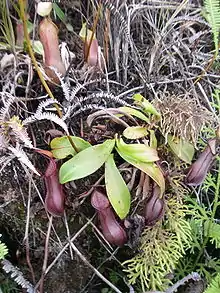 Nepenthes tobaica is very abundant in the Lake Toba region,[10] to the point where it is "difficult to avoid seeing it there".[5] N. tobaica is also known to grow in high altitude peat swamp forest near Lake Kerinci, at an altitude of 1100 m. At this location, the species grows alongside N. ampullaria, N. gracilis, N. mirabilis, N. reinwardtiana, and N. spathulata. The Nepenthes species and hybrids at this site exhibit high levels of introgression. The vegetation is dominated by species of the genera Rhododendron and Melastoma, as well as orchids and ferns. It is very stunted and dense, with few trees exceeding 3 m in height. It is somewhat reminiscent of the highland heath forests around Bareo in Sarawak, Borneo.[5]