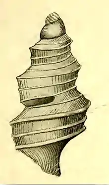 (Original description) The small, white, thin shell consists of 5 whorls, including the prominent conical protoconch of 2 convex elate whorls, with exserted apex. The whorls of the spire have a corded obtuse angulation, with a slope from the upper suture, somewhat constricted towards the lower. The body whorl shows a second angulation starting from the suture at the aperture. Below this the base is rapidly concavely contracted. The aperture is obliquely oval. The siphonal canal is short. The outer lip is thin, simple and biangulate. There is a deep, narrow sinus at the suture with parallel margins. The outer lip is in profile slightly convex to the front angulation, then concave to the edge of the siphonal canal. The columella is very long, nearly straight. When looked at from the apex the shell is faintly polygonal, with ten angles in a spiral (in a cotype these are produced into transverse sharp tubercles). A single spiral runs between the angulation and the upper suture, and in the body whorl bounds the front of the posterior sinus. Another lies midway between the angulation and the lower suture. In the suture, the second angulation of the body whorl may appear as a sutural cord. This bounds the back of the posterior labral sinus. Concave forward axials run from the suture to the nearest spiral, then become straight and very oblique from this to the first angle, then vertical to the next angle, and are lost on the base. They do not cross the spirals or stand erect. [2]