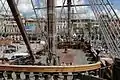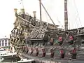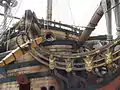 The ship is an accurate replica above the waterline, but sporting a partly steel hull, planked in timber and two main engines with Schottel drive.
