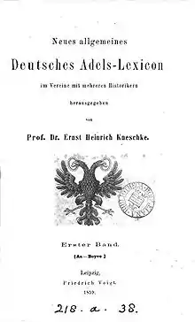 Neues allgemeines Deutsches Adels-Lexicon or New General German Aristocracy Lexicon is the title of a series of historical reference books written by Professor Dr. Ernst Heinrich Kneschke about the German aristocracy, including royalty and nobility. This series is one of the most inclusive source of the German Aristocracy.