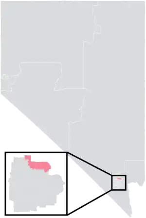 The district is entirely located within Nevada's 4th congressional district, and overlaps with the 1st and 17th districts of the Nevada Assembly.[5] It has a surface area of 48.5 square miles (126 km2) and a perimeter of 33 miles (53 km).[6]