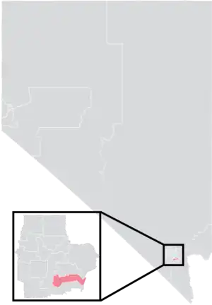 The district is located entirely within Nevada's 3rd congressional district, and overlaps with the 21st and 29th districts of the Nevada Assembly.[4] The district has a surface area of 26.2 square miles (68 km2), and a perimeter of 34.3 miles (55.2 km).[5]