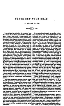 "Never Bet the Devil Your Head: A Moral Tale" is a short story by American author Edgar Allan Poe, first published in 1841. The satirical tale pokes fun at the notion that all literature should have a moral[1] and spoofs transcendentalism.