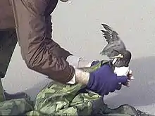 An oil-soaked bird is rescued by a cleanup worker after the New Carissa wreck.
