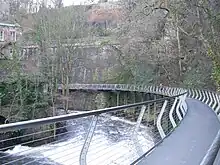 New Mills sits above The Torrs, a dramatic gorge through which the Rivers Goyt and Sett flow. In a bend of the Goyt is Torr Vale Mill, a Grade II* listed building. The Torrs Millennium Walkway, overlooking the mill, was built at a cost of £525,000 (with almost half provided by the Millennium Commission) by Derbyshire County Council's in-house engineers. The walkway spans the otherwise inaccessible cliff wall above the River Goyt. Part rises from the riverbed on stilts and part is cantilevered off the railway retaining wall. It provided the final link in the 225-mile (362 km) Midshires Way (here following the Goyt Way) and was opened in April 2000.[23]