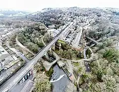 ![]() Two rivers, two railways, a canal, and various roads all converge to form a town on differing levels. Hills rising out to the nearby Peak District surround the central viaducts and bridges. | |