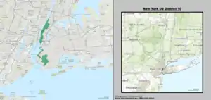 The 2010 map had a size of 14.25 sq mi (36.9 km2), New York's 10th district was the second-smallest by total area in the country, after New York's 13th.[5] Demographically, it also had the largest number (270,000) and the highest percentage of Jews (37.6%) of any congressional district,[6] largely as a result of the fact that it included several heavily Jewish neighborhoods of Manhattan and Brooklyn. Prior to the 2020 census, the district stretched from the Upper West Side of Manhattan to Borough Park.