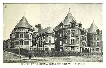 The New York Cancer Hospital (NYCH) on the Upper West Side of Manhattan, New York City was a cancer treatment and research institution founded in 1884. The building was located at 455 Central Park West[2] between West 105th and 106th Streets, and built between 1884 and 1886 with additions made between 1889 and 1890; it was designed by Charles Coolidge Haight in the Late Gothic and French Chateau styles – inspired by the chateaux of the Loire Valley. It was the first hospital in the United States dedicated specifically for the treatment of cancer, and the second in the world after the London Cancer Hospital.[3][4][5] After outgrowing the original building and moving, it became what is today known as Memorial Sloan-Kettering Cancer Center.