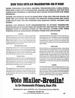 Mailer’s vociferous candidacy ("New York Gets an Imagination – or It Dies!") convinced opinionated Queens newspaper columnist Jimmy Breslin to abandon his own mayoral quest and join the higher profile Mailer as his City Council President running mate.[3] In a Time interview published four days before the primary, Mailer called himself a "left conservative" – left because he believed the city's problems demanded radical answers, conservative because he had little faith in centralized government. Mailer said that, if he were to win the primary and be elected in November, "a small miracle would have happened. At that moment the city would have declared that it had lost faith in the old ways of solving political problems and that it wished to embark on a new conception of politics."[4]