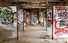 The interior of one of the farm's buildings in 2016. The partitions have been painted with graffiti.