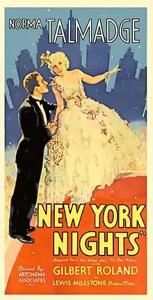 New York Nights is a 1929 American pre-Code crime film, directed by Lewis Milestone, and based on the 1928 play Tin Pan Alley by Hugh Stanislaus Stange.[2] The film is known for being leading actress Norma Talmadge's first sound film.