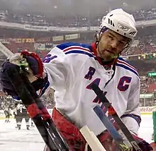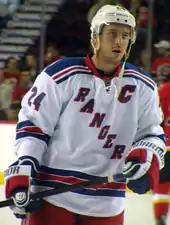 In March 2000, Smith was fired along with head coach John Muckler, and that summer, James Dolan hired Glen Sather to replace him.[25] By the end of the 2000–01 season, the Rangers had landed a significant amount of star power. Messier had returned to New York, Theoren Fleury joined the Rangers after spending most of his career with the Calgary Flames[26] and Eric Lindros was traded to the Rangers by the Flyers.[27] The Rangers also acquired Pavel Bure late in 2001–02 from the Florida Panthers.[28] It was also the rookie season of goalie Dan Blackburn, who made the NHL All-Rookie Team even as the Rangers fell back to last place in the Conference,[29] and finished out of the playoffs. Later years saw other stars such as Alexei Kovalev, Jaromir Jagr, Martin Rucinsky and Bobby Holik added, but in 2002–03 and 2003–04, the team again missed the playoffs. Blackburn started strongly in 2002–03, but burned out after 17 games. He missed 2003–04 due to mononucleosis and a damaged nerve in his left shoulder. Blackburn could not rehabilitate the damaged nerve, and was forced to retire at the age of 22.[30] Towards the end of the 2003–04 season, general manager Glen Sather finally gave in to a rebuilding process by trading away Brian Leetch, Alexei Kovalev, and eight others for numerous prospects and draft picks. With the retirements of Pavel Bure and Mark Messier, as well as Eric Lindros signing with the Toronto Maple Leafs, the post-lockout Rangers, under new head coach Tom Renney, moved away from high-priced veterans towards a group of talented young players, such as Petr Prucha, Dominic Moore and Blair Betts.