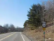 NY 224 was assigned as part of the 1930 renumbering of state highways in New York. Initially, the route began at NY 14 in Montour Falls and ended at NY 223 near the hamlet of Swartwood. From there, NY 223 continued east through the village of Van Etten to the village of Candor over what was previously designated as part of NY 53 from the mid-1920s to 1930.[2][4][5] NY 223 was truncated in the early 1950s to end at NY 224 in Swartwood. The former routing of NY 223 from Swartwood to Van Etten became an extension of NY 224.[6][7]