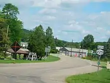 Across the county line in the town of Caton, NY 225 continues west through the gully for another 2 miles (3.2 km), slowly rising in elevation as it heads past a small number of isolated homes. The creek reaches its source near NY 225's junction with the southern terminus of CR 34 (Whiskey Creek Road), at which point the route ascends out of the valley and heads southwest across lightly developed, relatively level terrain to the small hamlet of Caton. In the center of the community, NY 225 intersects CR 32 (Caton–Seeley Creek Road) and CR 120 (Tannery Creek Road). NY 225 turns northwest at this intersection, becoming Caton Road as it follows Caton Creek out of the hamlet.[3]