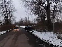 NY 261 continues northeast past the Lake Ontario State Parkway,[1] serving a line of homes overlooking Braddock Bay to the southeast, and eventually Lake Ontario to the east.[4] Until January 2017,[5] state maintenance of NY 261 ceased just northeast of the junction with the parkway, at which point it became county-maintained as the unsigned CR 272.[6] Roughly 0.5 miles (0.8 km) northeast of the Lake Ontario Parkway, NY 261 reached the lakeside hamlet of Manitou Beach. The route turned southward before reaching the lake shore, however; instead, it parallels the shoreline for 200 yards (183 m) before terminating at an isolated dead end south of the hamlet.[1][4]