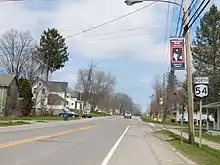 NY 54 continues north through Penn Yan on West Main Street, crossing the outlet into the Kenka Mills section. Within Kenka Mills, NY 54 remains a two-lane commercial street, intersecting with the northern terminus of its child route, NY 54A (Elm Street). NY 54 continues north along Main Street until the intersection with Clinton Street, where it turns east, crossing a local railroad before leaving downtown Penn Yan as a two-lane residential street. After crossing northeast through Penn Yan, NY 54 intersects with North Avenue (former CR 20). Just after this junction, NY 54 enters the town of Benton. Within Benton, NY 54 becomes a rural two-lane roadway, intersecting with the southern terminus of CR 15 (Pre-Emption Road) before crossing into the town of Torrey. After entering Torrey, NY 54 intersects with CR 9 (Ridge Road).[3]