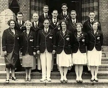 Harry Amos was appointed Chef de Mission;[6] at the time he was referred to as chairman.[1] His wife acted as chaperon and travelled to the Olympics at their own expense. A masseur from Wellington, C. Dickinson, accompanied the team in an honorary capacity.[1][7] Swimmer Kathleen Miller, 19 years old at the time, was accompanied by her mother Annie Miller as a chaperone.[8] Therefore, the ten athletes were accompanied by four others to the Olympics.[2]