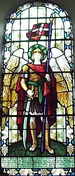 The stained-glass east window by Abbot & Co. of Lancaster dates to 1845 and was paid for by local residents to commemorate the rebuilding of the church. It displays Christ holding the wine and bread beneath the words, "I am the true vine, I am the living bread". A stained glass in the middle south wall window (the only other in the church) by Shrigley and Hunt displays St Michael in armour with a lion's head on his shoulder. The window is a memorial to Thomas Roscre Johnston, killed in World War I.[8][9]