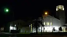 Newport Harbor High School received funding from Measure F that included demolition of the 70,000-square-foot (6,500 m2) Robins-Loats building,[7] its replacement by an all new 100,000-square-foot (9,300 m2)[9] steel-framed building, and rebuilding the landmark 100-foot (30 m) bell tower. The "Robins-Loats Reconstruction" costs are estimated at $45 million.[9] The original Robins Hall Tower stood for 77 years.[10] The tower was demolished in August 2007 because of earthquake code requirements.[11]